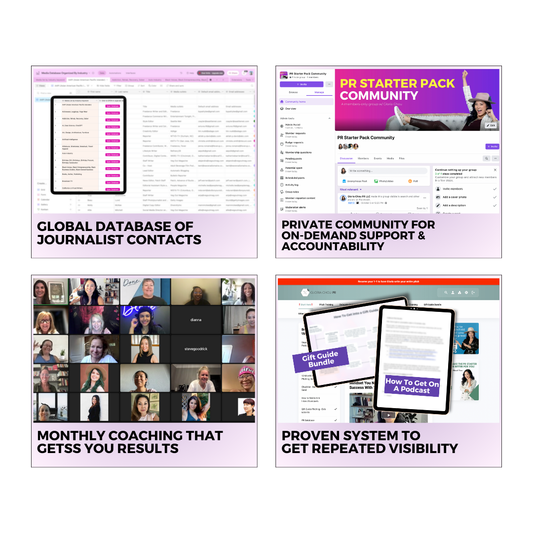 The PR Starter Pack is a one-of-a-kind inclusive community, proven PR system, proprietary journalist database, and high-level coaching for driven small business founders who want to write & share their stories with the world WITHOUT relying on gatekeepers or staying inside a box someone else built.